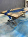 The Walnut Dining Table is a piece of furniture that has a place for a group of people to gather around and enjoy a meal. Table top can also be used for reading newspaper or books. The table is made from a walnut wood. Epoxy wood table is custom and handmade. All edges of the table are handsanded for smooth surface. The raw walnut wood used in its natural form is a sturdy and durable type of wood that is perfect for a table. The legs also assist the table top for even position. The table top has dark blue resin color that has a metallic sheen to it.